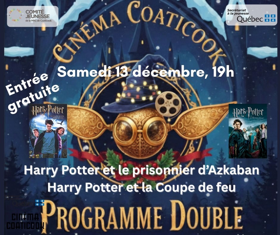 L’Escouade jeunesse de la MRC de Coaticook, vous invite à l’événement « Une Soirée au Ciné – Spécial Harry Potter », qui se tiendra le samedi 13 décembre, à 19h, au Cinéma de Coaticook.